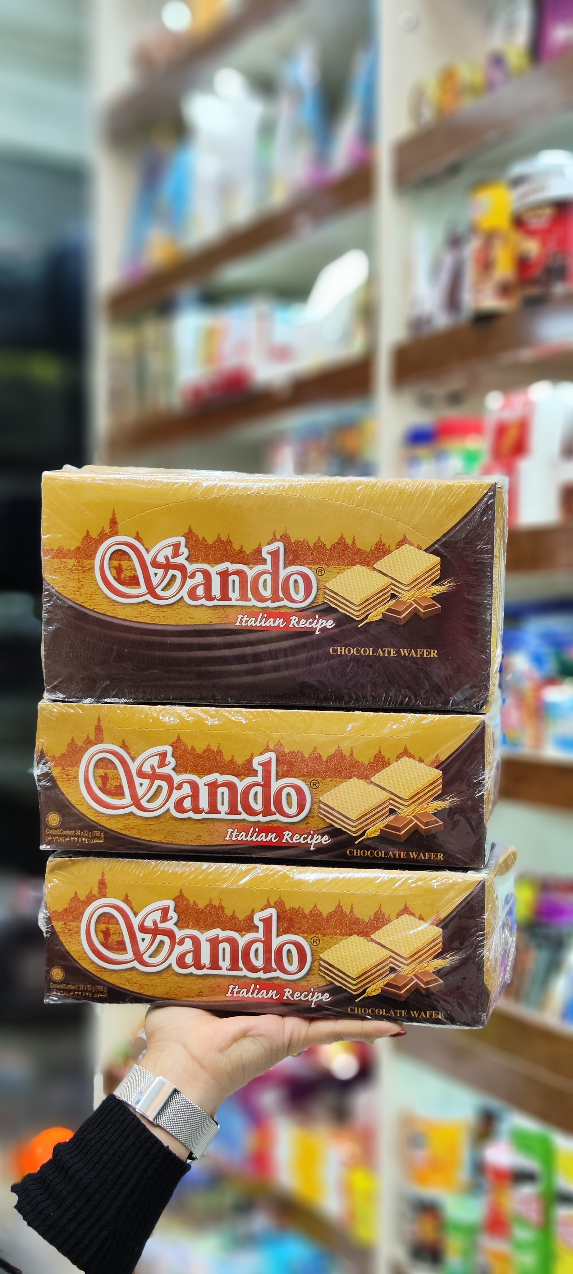 ویفر شکلاتی ساندو(sando) با لایه هایی از خامه شکلاتی طعمی بسیار لذیذ با بافتی ترد دارد. ویفر ساندو یک گزینه عالی برای یک صبحانه یا میان وعده سریع و پرکننده و همچنین همراهی عالی برای نوشیدنی های گرم در محل کار و مدرسه برای کودکان شما است و این محصول در همه سنین محبوب است. این محصول که یکی از معروف ترین ویفرها در بسیاری از نقاط جهان به ویژه ایران است در کشور اندونزی تولید می شود. در کشور ما طرفداران زیادی برای این ویفر ترد و خوشمزه وجود دارد.