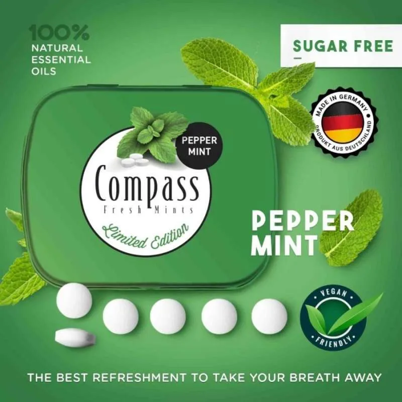خوشبوکننده دهان «کمپاس» (Compass) یک محصول آلمانی است که به دلیل عدم استفاده از شکر و استفاده از شیرینکنندههای مصنوعی مانند «آسه سولفام» (acesulfame)، برای افرادی که به دنبال محصولات بدون قند هستند، گزینهی مناسبی است. این خوشبوکنندهها در طعمهای مختلفی از جمله نعناع، میوههای وحشی، لیمو، و ... تولید میشوند.ویژگیهای خوشبوکننده دهان کمپاس:فاقد شکر:به جای شکر از شیرینکنندههای مصنوعی استفاده میشود که برای سلامت دندانها بیخطر است و برای افراد مبتلا به دیابت نیز قابل استفاده است.